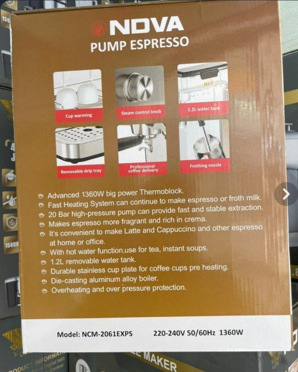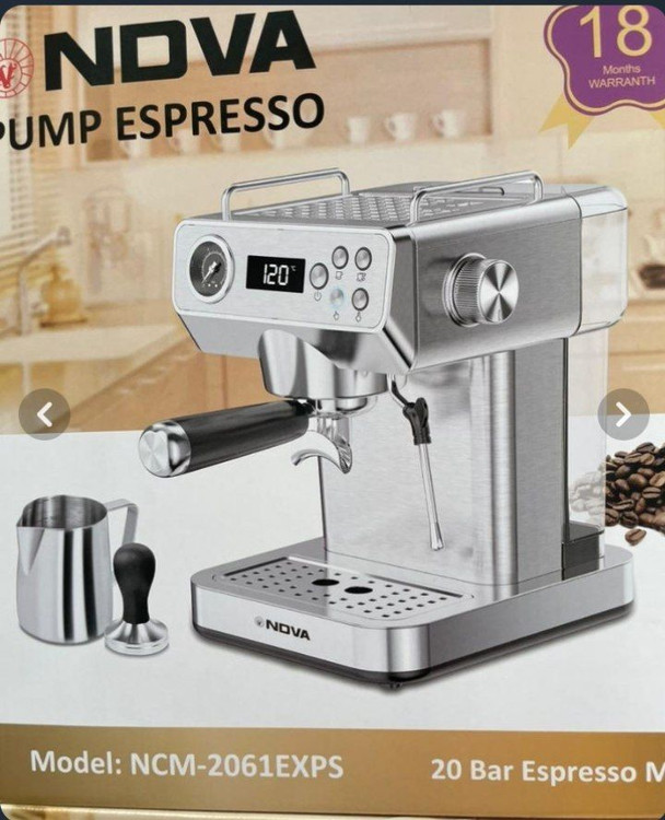 اسپرسوساز NDVA مدل NCM‑2061EXPS یک دستگاه حرفهای و خوشساخت است که برای کسانی طراحی شده که میخواهند کیفیت واقعی قهوه را در خانه یا محل کار تجربه کنند. ترکیب فشار پمپ ۲۰ بار واقعی، توان ۱۳۶۰ وات و سیستم گرمایش ترموبلاک پیشرفته باعث میشود عصارهگیری قهوه با دقت بالا، سرعت مناسب و کرمای غلیظ انجام شود.